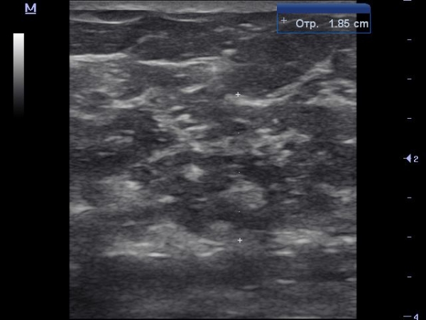 Вот пример когда паренхима железы полностью замещена жировой и фиброзной тканью, что характерно для постменопаузального типа строения молочной железы.