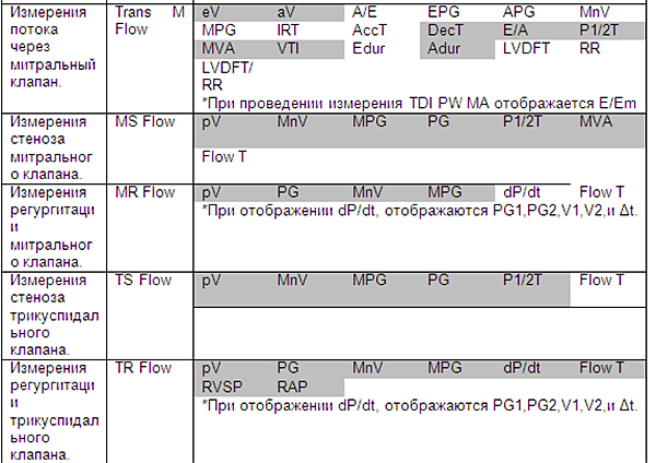 Вот таблица, которая показывает, что можно померить на митральном, а что на трикуспидальном клапане.