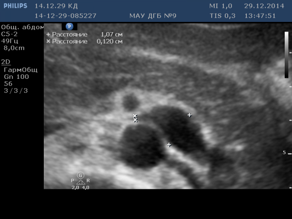 Вот пример из практики. У пациента (подростка) варикоцеле слева 3 степени. Фото - на уровне аортомезентериального отдела. Определяется расширенная левая почечная вена.