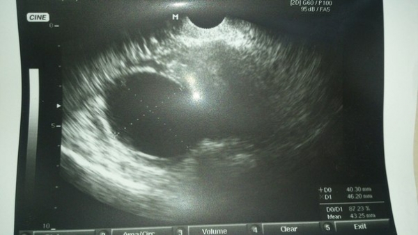 Не похоже на беременность, хотя скорость слишком большая для определения кровотока... Что с тестом на беременность? Желательно контроль через 7-10 дней.