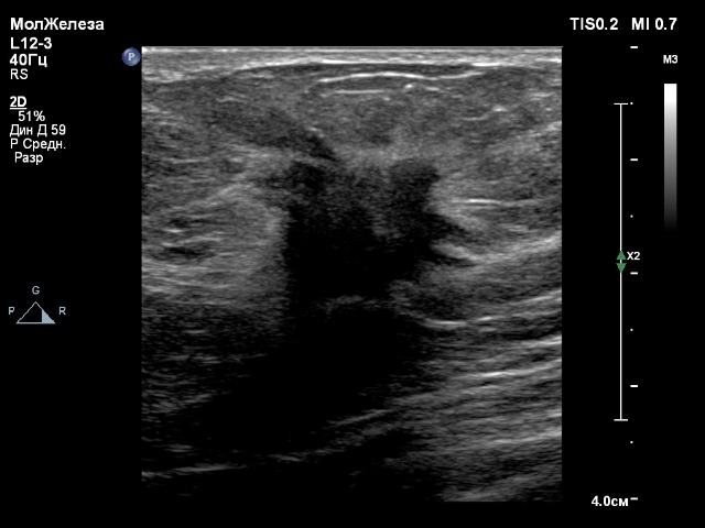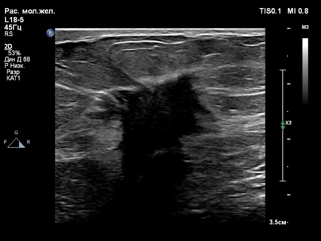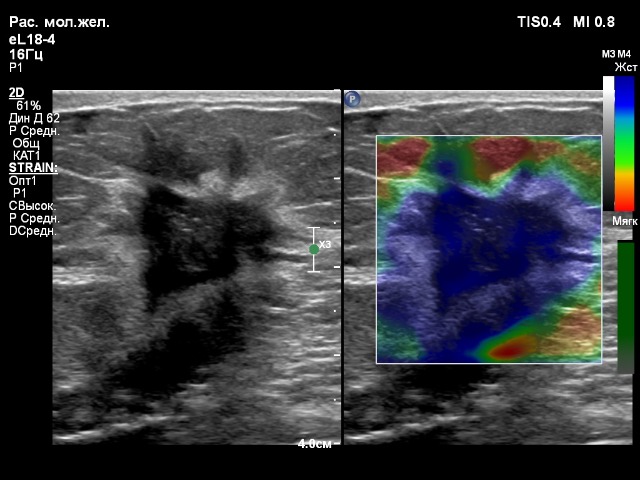 Компрессионная эластография данного образования молочной железы на датчике eL18-4 получилась быстро и качественно, а на датчике L18-5 хуже получалась, индикатор качества не поднимался до верха, что указывало бы на высокое качество эластограммы, которую можно оценивать. На датчике eL18-4 можно сказать влёт.