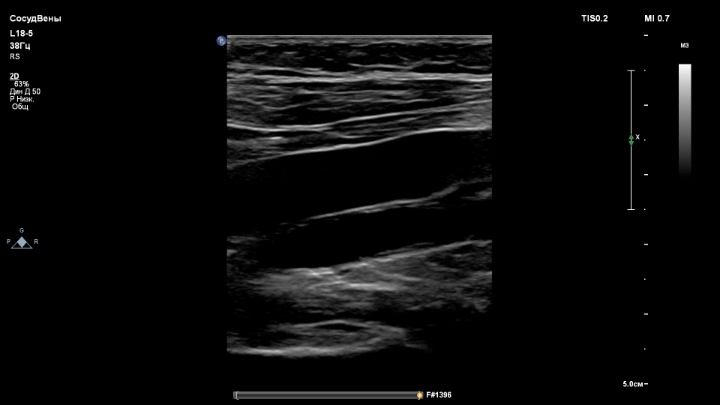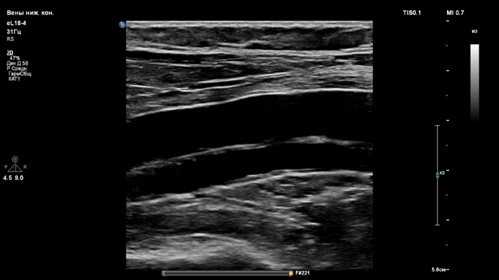 Подколенная вена без тромба, один пациент, три линейных датчика.