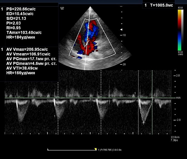 Скорость ВТЛЖ около 1 м/с (фото не сохранил). На аортальном клапане ускорение кровотока до 2,06-2,2 м/с. Тахикардии нет, ЧСС - 59 в мин.Однозначно имеется аортальная недостаточность до 2 ст. Непонятно на каком основании выставляется аортальный стеноз? Какова скорость в ВТЛЖ и скорость трансмитрального кровотока? Есть ли тахикардия? У молодых людей на фоне тахикардии можно получить очень высокие скорости на клапанах! Почему-то все забыли о площади аортального отверстия