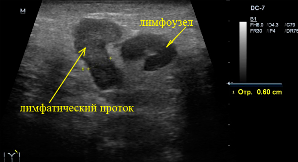 На самом деле лимфоузлов здесь не так и много, в основном визуализируются расширенные лимфатические протоку - лимфангит.