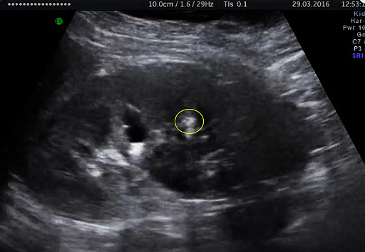 на последних секундах ролика отчетливо видно гиперэхогенное гладкое овальное образование в расширенной верхней чашке без акустической тени ,виден в разных положениях и при ЦДК , расценила как конкремент.