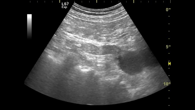 Интересный случай, на ролике при первом просмотре в просвете ничего не увидел, посчитал гипоэхогенность артефактом усиления.